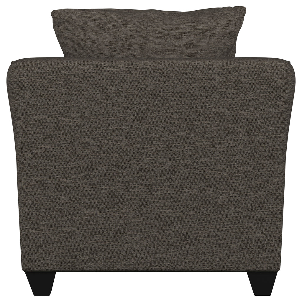 Designed for versatility and comfort, this accent chair embodies contemporary simplicity with flared arms and tailored upholstery. Plush cushions with resilient foam fill invite relaxation, while its sculpted silhouette pairs beautifully with a sofa or loveseat. Whether completing a coordinated ensemble or standing alone as a reading chair, its refined form and durable construction make it a lasting favorite for everyday use._x005F_x000D_ Key Features: • Single accent chair with flared arms and smooth sand-tone upholstery • Soft polyester fabric enhances comfort and contemporary appeal • Plush foam seat and back create a supportive sitting experience • Rounded arm design offers visual warmth and ergonomic comfort • Espresso tapered legs stabilize and accent the sleek proportions • Ideal as a reading chair or coordinated companion piece