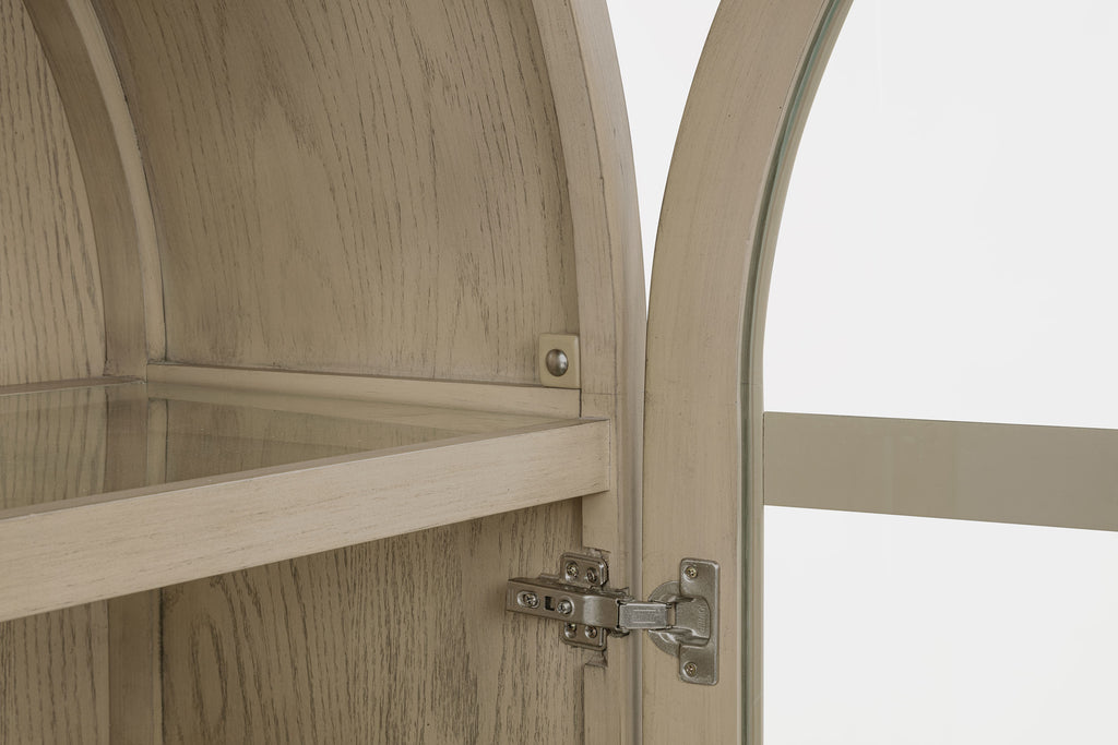 Elevate your space with this sophisticated vitrine cabinet, designed to showcase your most treasured items with style. Featuring two wood-framed tempered glass doors, the upper section offers four tiers of shelving, perfect for displaying decor, dinnerware, or collectibles. The lower section of the cabinet provides additional storage with two hand-woven cane doors and a shelf inside for hidden organization. Crafted from solid wood, engineered wood, and oak veneer, this display cabinet offers both open display and concealed storage options. Its timeless arched design and natural wood finish make it a perfect addition to dining rooms, living spaces, or home offices. Key Features: • Elegant beige oak vitrine cabinet with arched design and wood-framed tempered glass doors • Four tiers of shelving in the upper section for showcasing decor or dinnerware • Lower two-door cabinet with a shelf for concealed storage • Crafted from solid wood, engineered wood, and oak veneer for durability • Hand-woven cane doors in the lower section add a natural, artisanal touch