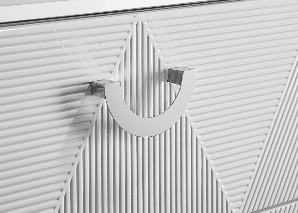 Sophisticated and dimensional, this six-drawer dresser and mirror set makes a bold statement in a high-gloss white finish. The dresser features geometric drawer fronts with fine ribbed texture forming inverted V patterns, paired with polished chrome U-shaped pulls. Black felt lines the top drawers for a touch of refinement, while 45mm metal extension glides ensure smooth operation. Above, the matching mirror glows with integrated white LED trim for ambient lighting and crisp contrast. Key Features: • Six-drawer dresser in white high gloss finish with sculpted geometric drawer fronts • Top drawers are fully lined in black felt to protect valuables and add a refined touch • Equipped with 45mm metal extension glides for smooth and quiet drawer operation • Polished chrome U-shaped pulls accent the textured surface with modern shine • Framed mirror includes integrated white LED trim for bright, ambient lighting • Crafted from engineered wood for a sleek and durable finish
