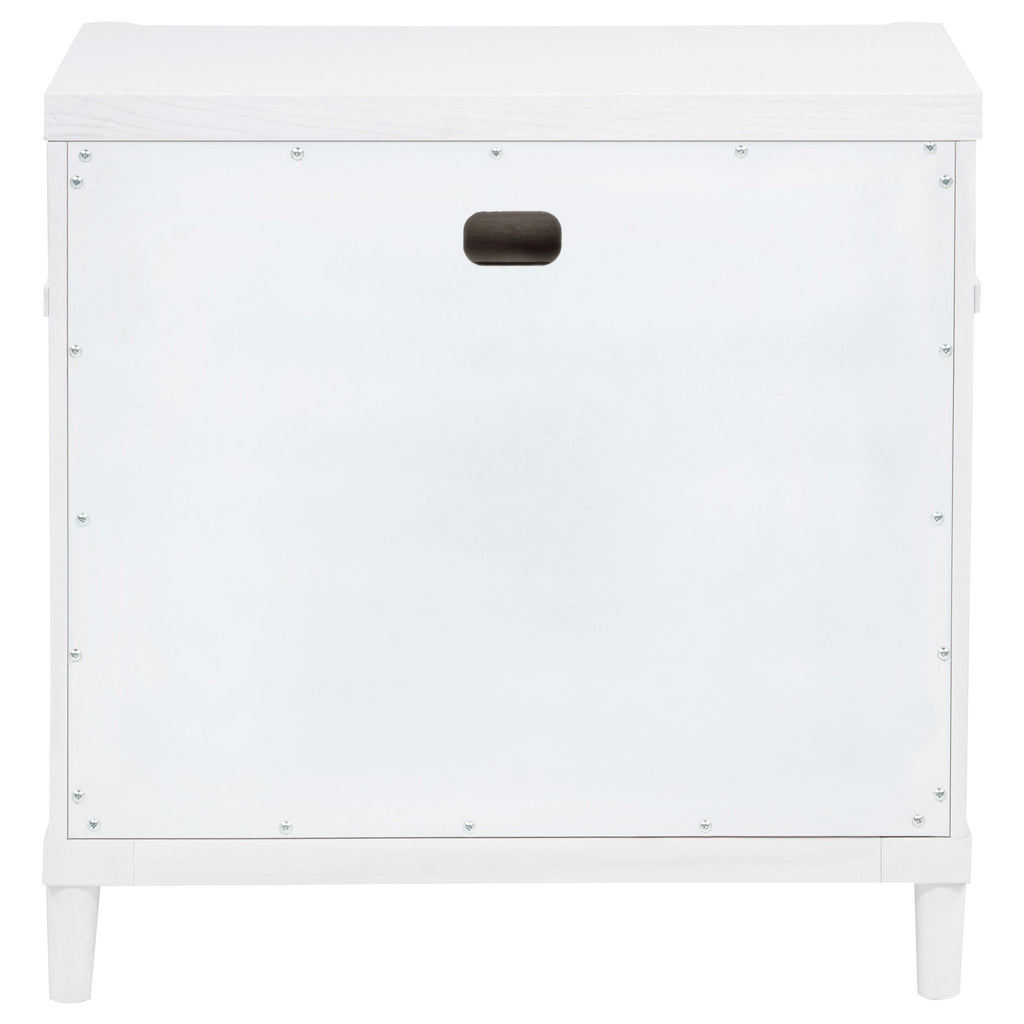 This three-drawer nightstand blends subtle curves with thoughtful convenience. Vertical metal accents and brushed nickel pulls contrast a white finish, while the felt-lined top drawer includes discreet cord access for device charging. Built from solid rubberwood, engineered wood, and a smooth laminate veneer, it offers smooth drawer movement and refined bedside storage in a compact silhouette. Key Features: • Three-drawer nightstand with curved edges and clean profile for modern bedside storage • White finish pairs with brushed nickel pulls and sleek vertical tube accents • Top drawer includes felt lining, tinted interior, and hidden cord access for charging • Drawer boxes feature dovetail joints and glide on 45mm heavy-duty metal runners • Built from solid rubberwood, engineered wood, and smooth laminate veneer • Fully assembled nightstand includes tip-over restraint for dependable bedside use