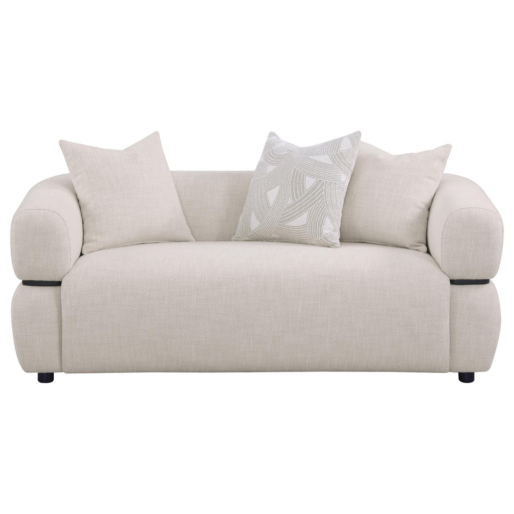 With a striking silhouette and artistic presence, this sculptural loveseat pairs bold form with inviting comfort. A distinctive solid wood waistband traces the frame, emphasizing its contemporary curve. Textured beige upholstery wraps the waterfall bench seat in a tailored embrace, punctuated by plush down and feather blend accent pillows. Constructed with pocket coil support for durability, this loveseat becomes an eclectic focal point in modern living spaces. Key Features: • Sculptural loveseat design features a waterfall seat and bold solid wood waistband detail • Includes accent pillows with textural covers and zippered closures • Pocket coil seating delivers durable support and lasting cushioned comfort • Upholstered in soft, woven polyester with tailored piping and tonal texture • Frame built from eucalyptus, engineered wood, and structural hardwood blend • Low back, deep seat, and curved form add bold softness to contemporary interiors