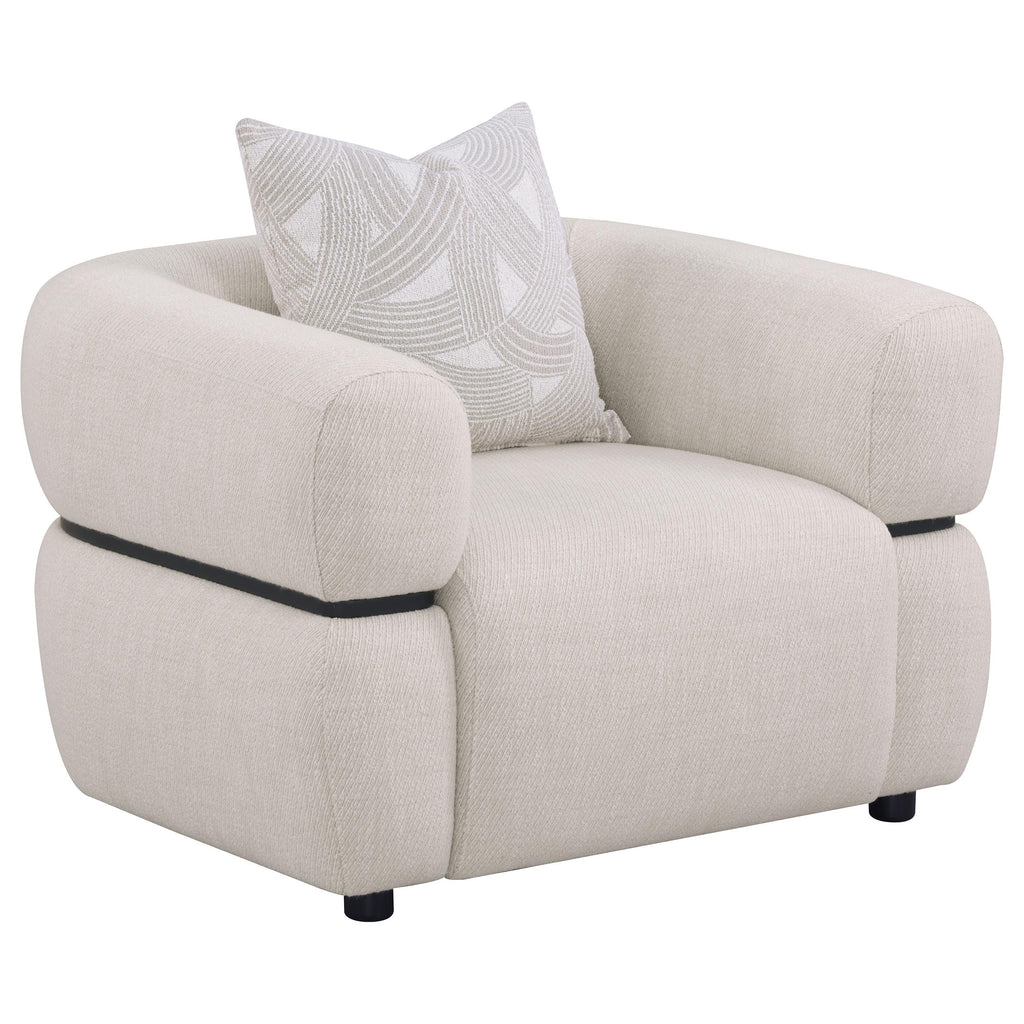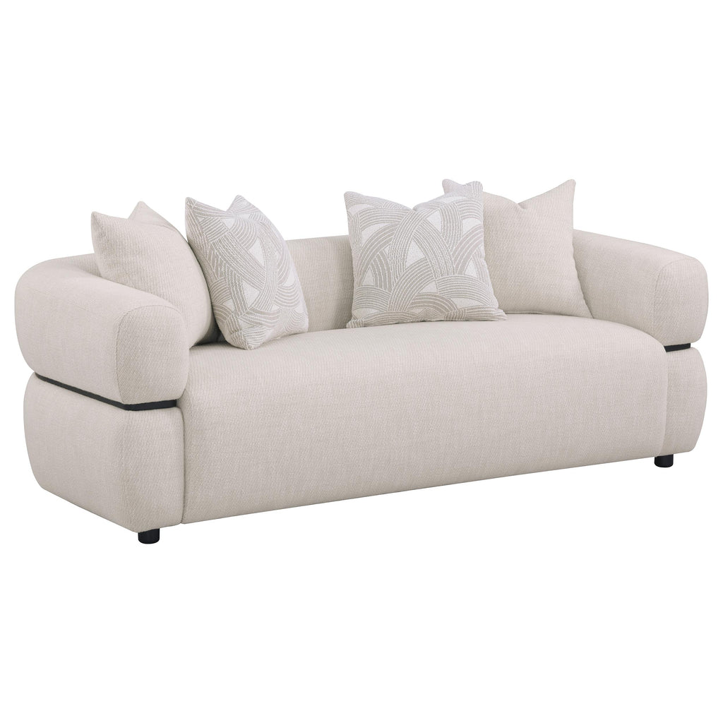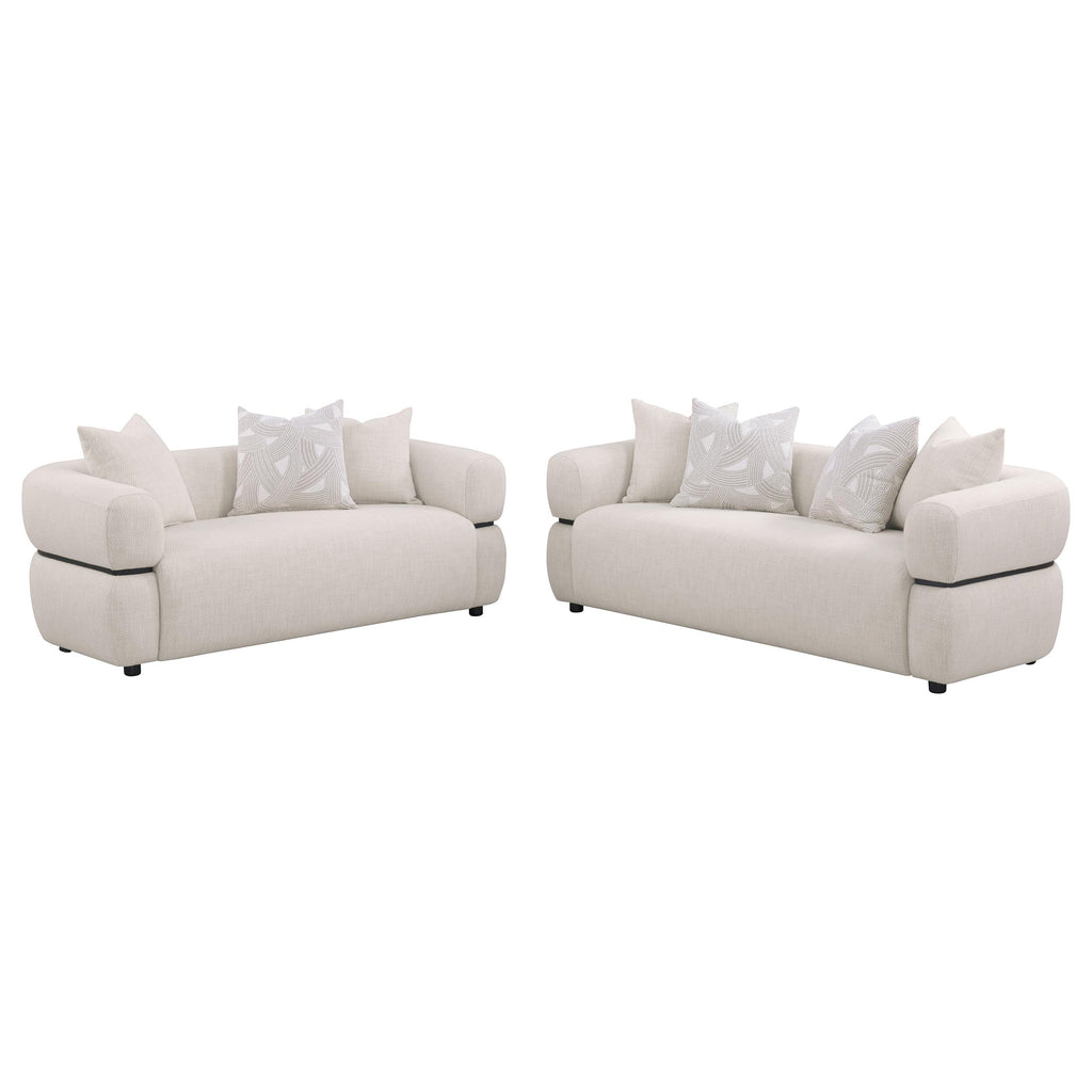Boldly sculpted and beautifully tailored, this modern sofa set showcases a seamless blend of dramatic curves and soft textures. Each piece features wide waterfall bench seats, structured with pocket coil support for lasting comfort. Wrapped in textured beige upholstery, the forms are accentuated by a solid wood waistband detail that encircles the exterior in refined elegance. Designed for statement living rooms, this set balances artful design with plush, lounge-ready seating. Key Features: • Sculptural sofa set in beige upholstery features waterfall bench seats and plush accent pillows • Soft textured fabric upholstery offers a tailored appearance with subtle tonal variation throughout • Pocket coil construction provides lasting comfort, support, and seating resilience across all pieces • Solid wood waistband wraps each frame in sculptural detail for a refined, distinctive profile • Frames built from eucalyptus, engineered wood, and hardwood offer durability and strength • Designed with bold modern curves and clean tailoring to elevate contemporary living spaces