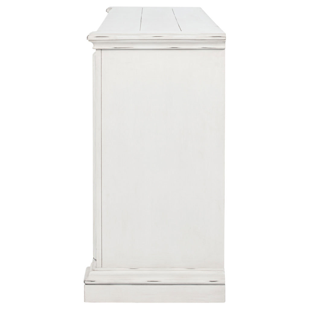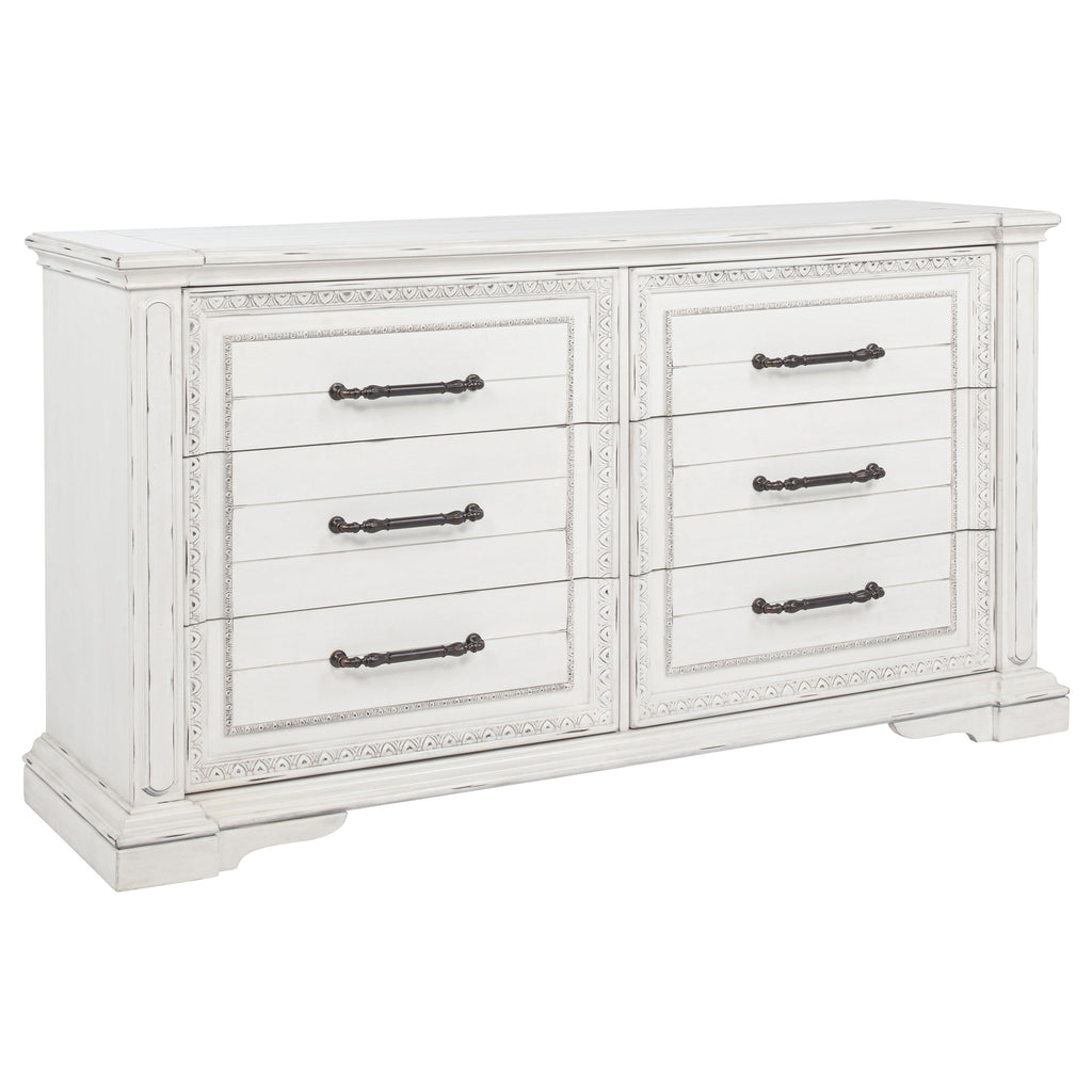 Classic and composed, this six-drawer dresser blends traditional design with elegant practicality. Its vintage white finish is gently distressed, accentuating ornate trim and antique bronze drawer pulls. A hidden jewelry tray tucked into the bottom drawer adds a thoughtful touch, while spacious drawers offer smooth functionality. Crafted from poplar and engineered wood, it brings heritage-inspired charm to any bedroom. Key Features: • Six-drawer dresser with traditional molding and carved details for timeless elegance • Vintage white finish adds aged softness with a warm, antique-inspired look • Antique bronze pulls bring contrast and decorative depth to the frame • Hidden jewelry tray in bottom drawer offers concealed accessory storage • Felt-lined top drawers and durable glides ensure quiet and smooth access • Crafted from poplar and engineered wood for strength and vintage appeal
