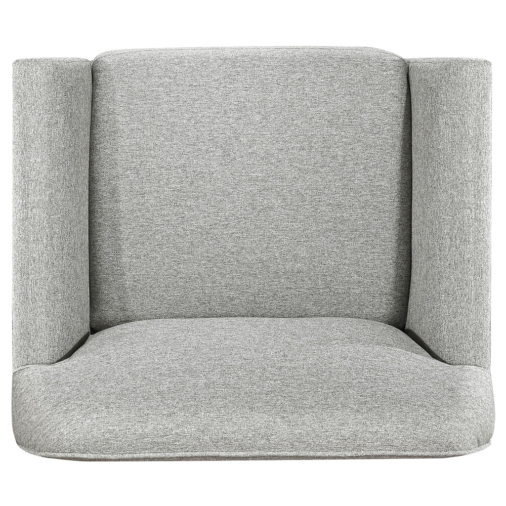 Clean lines and retro curves define this accent chair’s inviting silhouette. Flared arms and a subtly rounded backrest deliver sculptural presence, framed in warm blonde wood. Wrapped in soft grey polyester upholstery and anchored by a rubberwood structure, this armchair balances comfort with design. Ideal for reading nooks, lounge areas, or paired seating, it brings a blend of timeless shape and cozy cushioning. Key Features: • Accent chair with flared arms and curved backrest for sculptural retro appeal • Blonde wood finish highlights the angular exposed frame with warmth • Single seat cushion delivers tailored support with plush foam filling • Soft grey polyester fabric enhances comfort with smooth tactile texture • Compact design fits seamlessly into reading corners or cozy lounge spots • Constructed from solid rubberwood for stability and durability