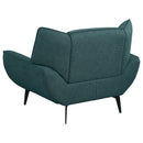 Bring the best of mid-century modern style to your casual space with this sofa set that inspires. This comfy and stylish teal blue set is a great choice for outfitting a living room or family room. Gorgeous fabric upholstery opens up possibilities for a lush palette choice. Flared arms and wing backs attach to non-removable seat and back cushions. Tapered black metal legs coordinate with the beautiful teal blue upholstery.